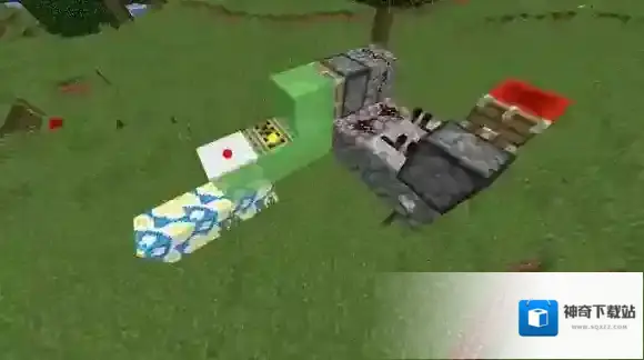 此时在粘液块上放置两段铁轨,再补放一个带釉陶瓦和一段铁轨。