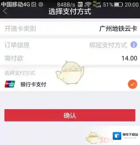 4、点击下面绑定银行卡并开通地铁云卡,确认相关信息,注意这里预付款14元