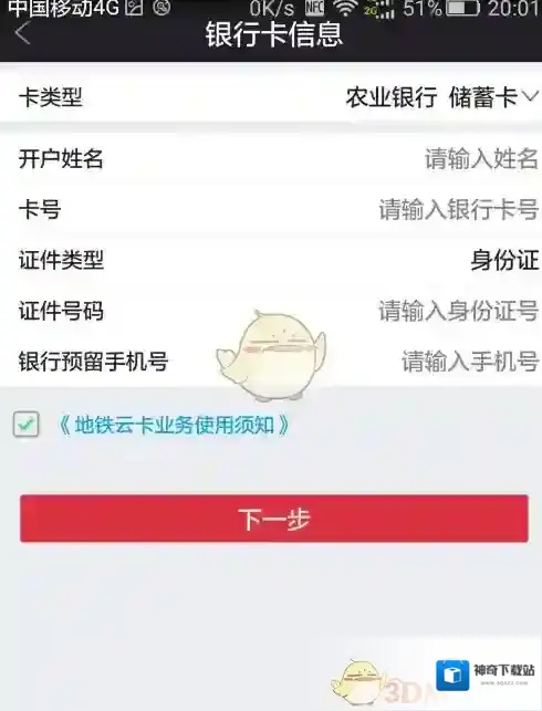 5、输入自己相关信息,包括开户名、卡号、身份证号,手机号等等,然后再一步