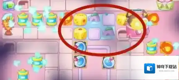 1、玩家首先在左上角放置蓝色武器,继续旁边放暖水袋,之后在中间放能量波。