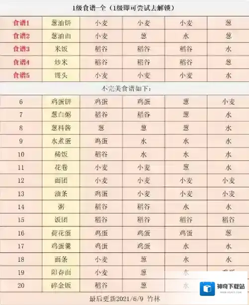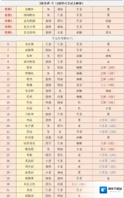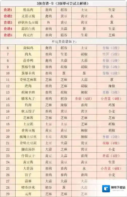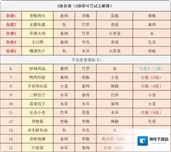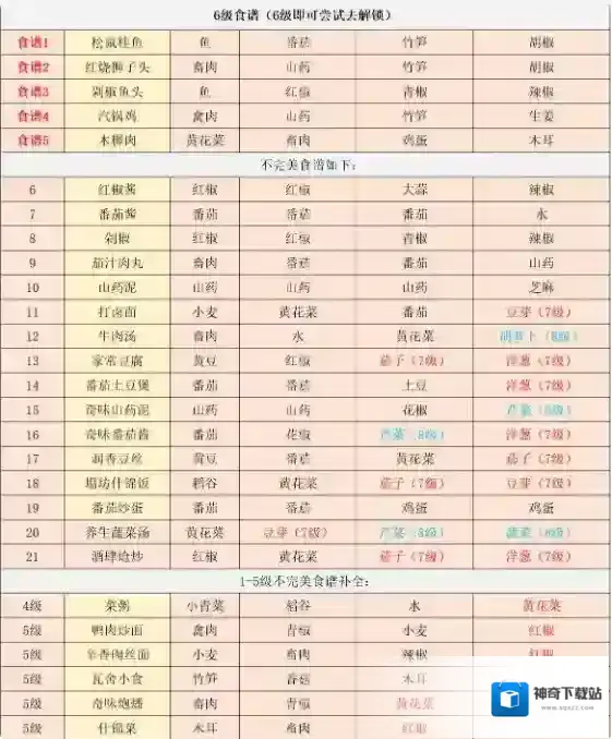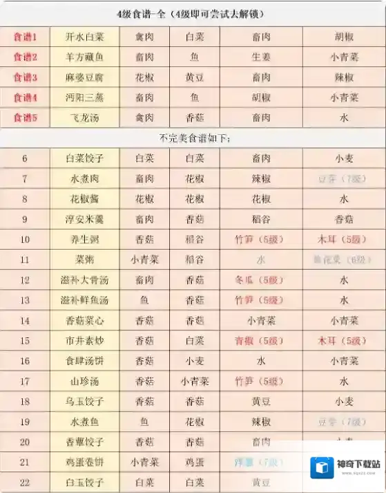 表格按等级解锁食谱,并且标记了高级食材的等级,以便于区分。