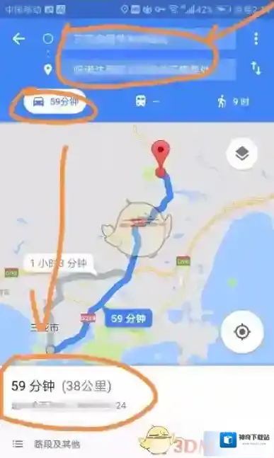 7、通过输入、地图点选、或者历史记录列表中选择起点或者终点后,可以查看到两点之间的行车线路及距离。
