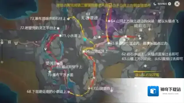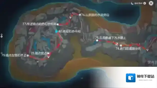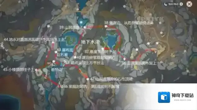 三个流明石原矿如下图红色圈所在位置,另外流明石23、46、56需要六级流明媒触才能开启紫晶屏障;还有一处倒立的锚点需要做魔神任务第二章第四幕开启。