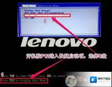 5、保存设置后自动重启进入LOGO画面时,一直按F12,选择U盘启动,如下图所示;