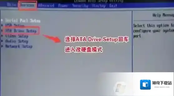 4、将键盘按方向左箭头移动Devices选项,把键盘移动ATA Drive Setup回车,将configure SATA as中默认的raid改成ahci模式,否则安装win7时会出现0x0000007b蓝屏,因为win7中没有集成raid硬盘驱动,然后选择F10保存设置,在弹出的选项中选择YES,如下图所示;