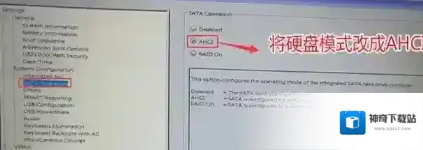 5、注意:切换到system configuration项,如果硬盘模式是raid,将sata operatior硬盘模式改为ahci模式,否则安装win7会同现0x0000007b蓝屏,改了后选择退出并保存BIOS,如下图所示;