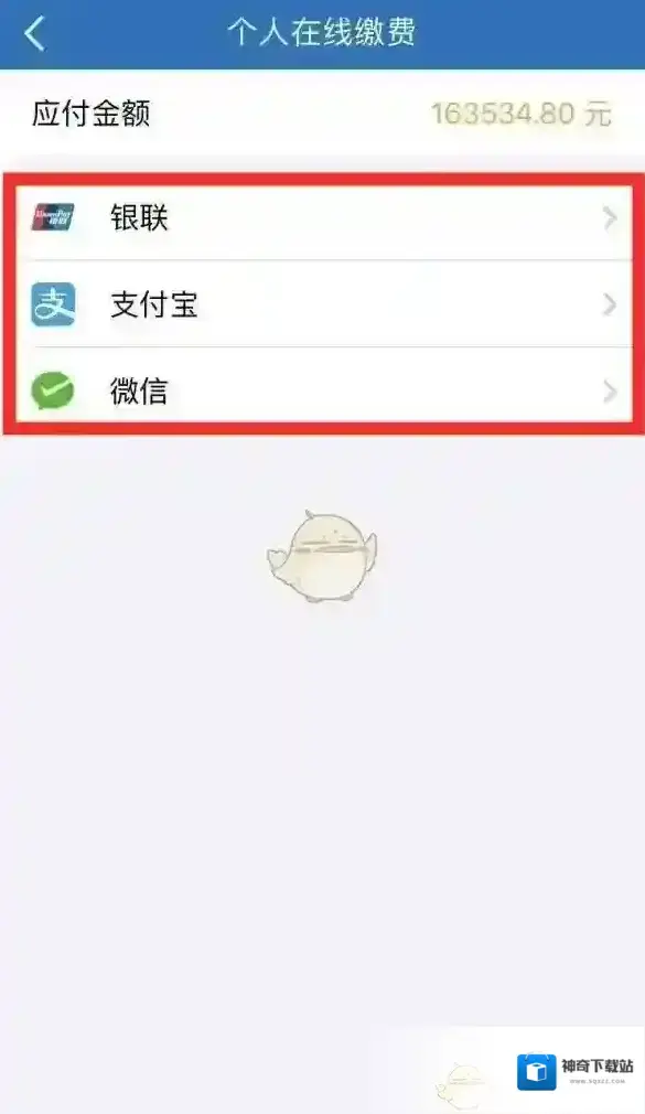 5、点击确认缴费后进入在线缴费或者个人缴费通知单下载界面。如您选择在线缴费,可通过银联、支付宝、微信完成在线缴费。如您选择临柜缴费,请下载并保存缴费通知单尽快去银行完成缴费。
