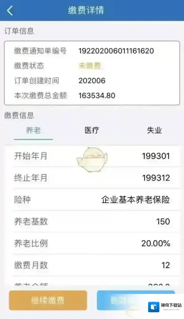 6、对于您已核定未成功缴费的信息,再次进入个人补间断模块时,系统会自动弹出相应核定单据,供您继续缴费或删除核定。如选择删除核定信息,则可以重新进入个人补间断模块操作。