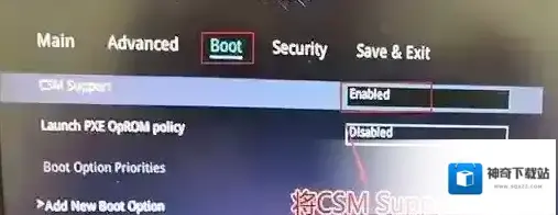 3、再切换到BOOT的选项,把CSM support由disabled改成enabled,开启兼容模式,如下图所示;