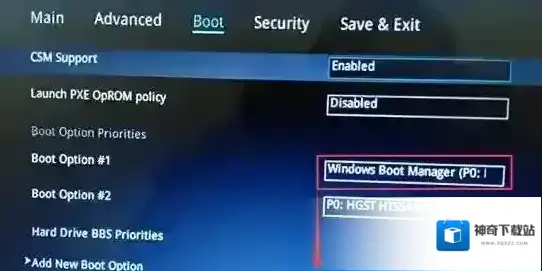 4、继续把boot option#1选项改为普通引导的,boot option#1和boot option#2硬盘启动位置对换,设置第一启动项为普通硬盘引导,带Windwos Boot Manager的为UEFI引导分区,然后按F10保存设置;