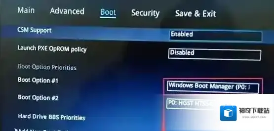 4、继续把boot option#1选项改为普通引导的,boot option#1和boot option#2硬盘启动位置对换,设置第一启动项为普通硬盘引导,带Windwos Boot Manager的为UEFI引导分区,然后按F10保存设置;