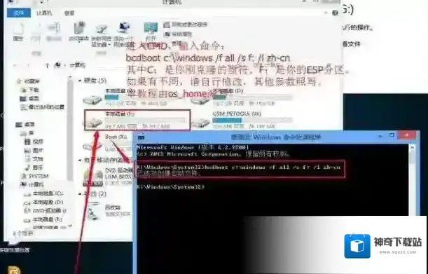 步骤四、修复引导1、现在开始使用命令把引导写入ESP分区,打开PE中的命令提示符,然后执行命令:bcdboot c:windows /f all /s f:/l zh-cn当提示已经成功创建启动文件的时候,写入就成功了。