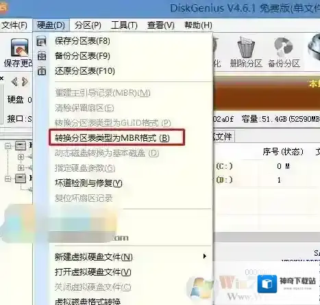 2、转GPT分区为MBR格式:删除分区后,装换硬盘分区表类型 为 MBR 格式,同样还是从“硬盘”–“转换分区表类型为MBR格式”,然后保存更改(以下为图示,此时该项为可点,如不可点说明已经转换好了。),如图: