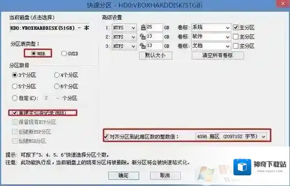 3、重新分区:磁盘格式转换完成后,点击快速分区,勾选 分区表类型为 MbR ,勾选了重建主引导记录MBR,选择需要分区的个数以及大小,当然大家可以点击“自定”来设置合适的分区,按下确定后开始分区(如果是固态硬盘或者是东芝的硬盘要进行4K对齐一下),如下图: