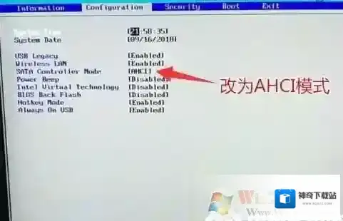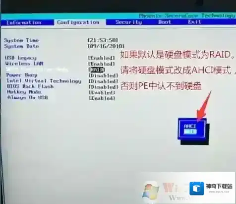 6、注意:再返回configuration这项,查看sata controller mode这项,如果默认硬盘模式为RAID或RST模式,请将硬盘模式改为AHCI模式,否则进PE后不能认出硬盘,如果更改后记得按F10保存,如下图所示;