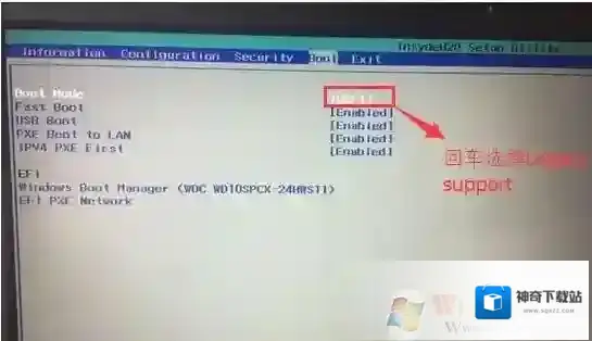 4、切换到Boot,把Boot Mode从UEFI改成Legacy Support传统引导,部分机器也可以采用uefi安装,但保险点还是改成传统模式,如下图所示;