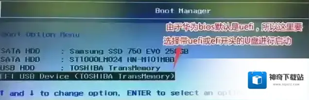 4、以上操作完成后,我们接着按键盘上的F10保存设置,然后将制作好的U盘启动盘(一定要记得必须要支持uefi启动的U盘)接到电脑上按F12,接着我们会看到启动菜单,我们选择带uefi或efi开头的U盘“回车”启动,如图: