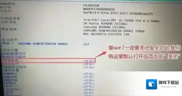 3、选然后我们再将键盘往下移动,将安全启动(Secure Boot)由默认的打开(enabled)状态改成关闭(disabled),如下图: