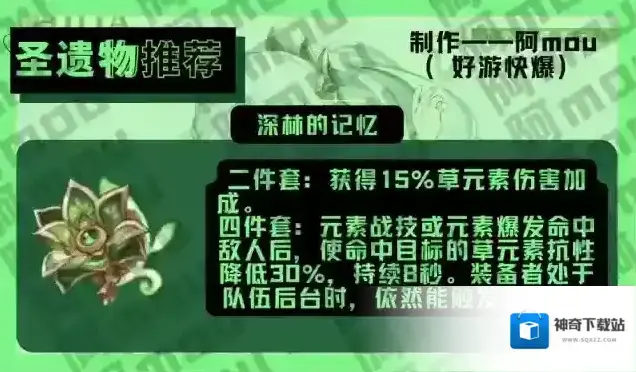 2套效果提高草伤,四套效果放战技减草抗,无论怎么说,都是可以直接/间接提高草神的输出强度。由于没有站场条件限制,草神站场/脱手侧重输出都可以用深林套