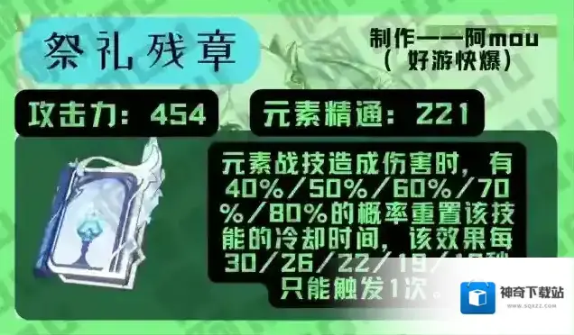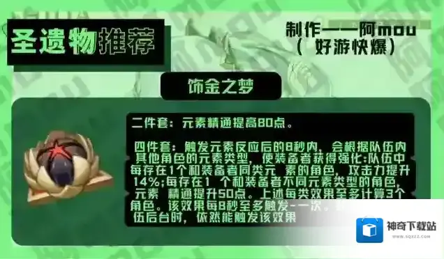 触发条件等类似四饰金,且是四星圣遗物更容易获取–别说打boss概率获取,在大世界探索时,有时候也能捡到。不过毕竟是四星圣遗物,上限低,至少前期拿来过渡还是没啥问题的。