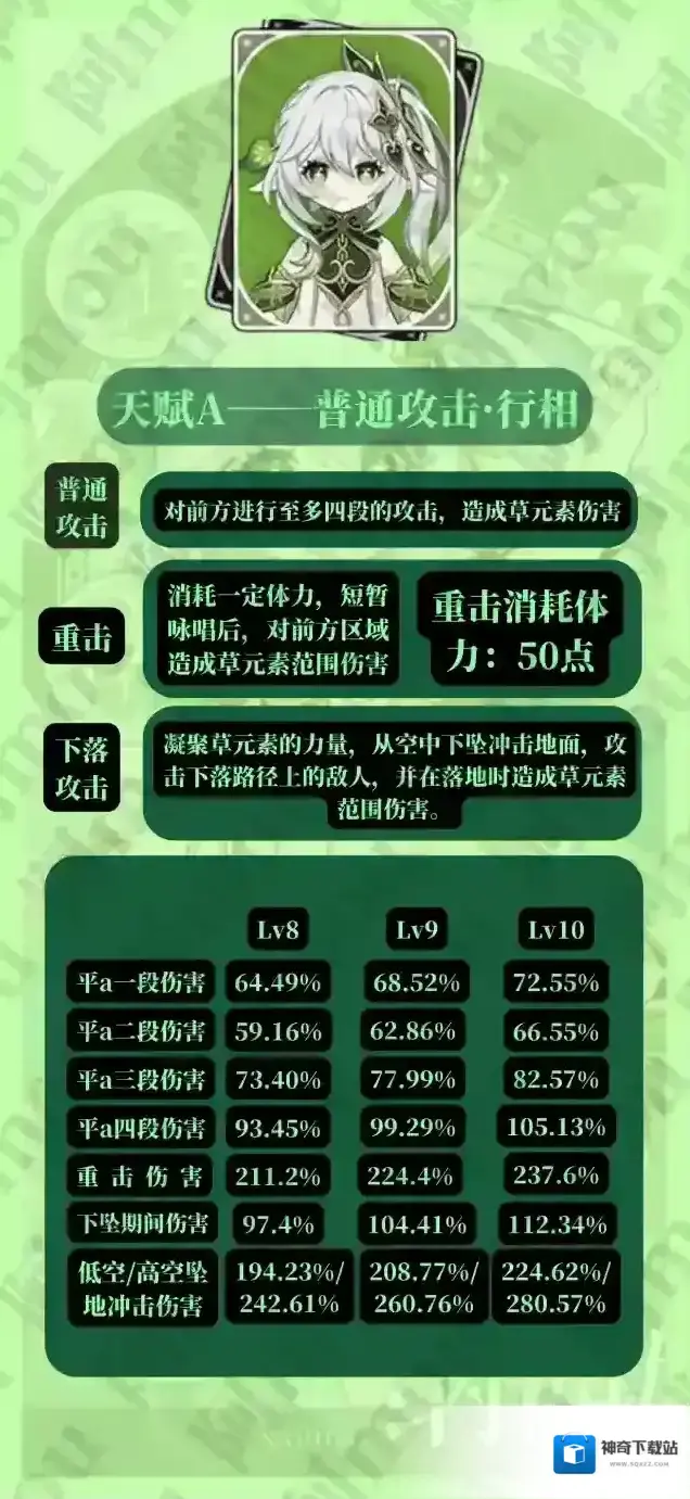数据可以看出,纳西妲的平a倍率一般(甚至可以说挺低),重击倍率一般,但一般不作为主要输出手段(因为不像某些角色那样(PS:烟绯)还有自身天赋加持–可以通过某种方式为自己提供额外增值)下落攻击更不用多说了