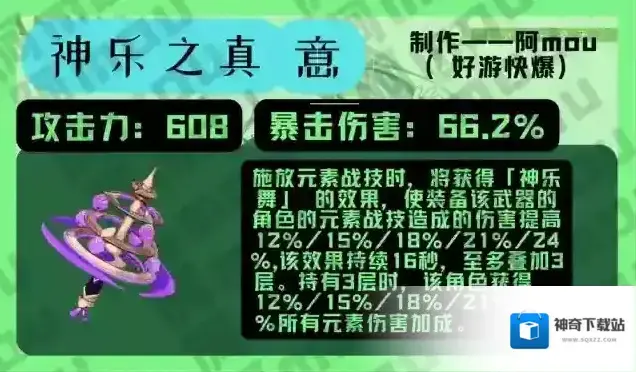 纯输出向武器。神乐铃白值和双暴不错,给草神提供输出向的面板基础,利用战技叠被动,提高自身战技伤害和所有元素伤害加成。武器富余的情况可以用这把武器提高小草神的输出强度(更适用于让草神站场的情况)