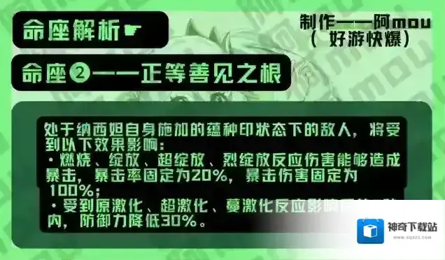 重点是第二效果,被战技蕴种印附着的怪物被触发各种激化反应防御力会降低30%,这等于17.6%的增伤效果,明显提高纳西妲在激化/绽放队里的辅助能力