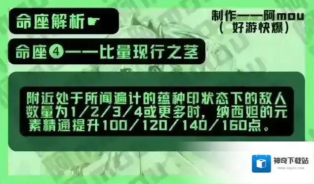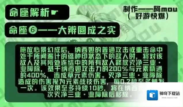 这算是纳西妲的质变命座了,开e接开Q以后平a/重击触发被动,可以造成不少的额外草伤(间隔很短),从而提高纳西妲的站场能力,让草神在氪力加持下可以作主使用