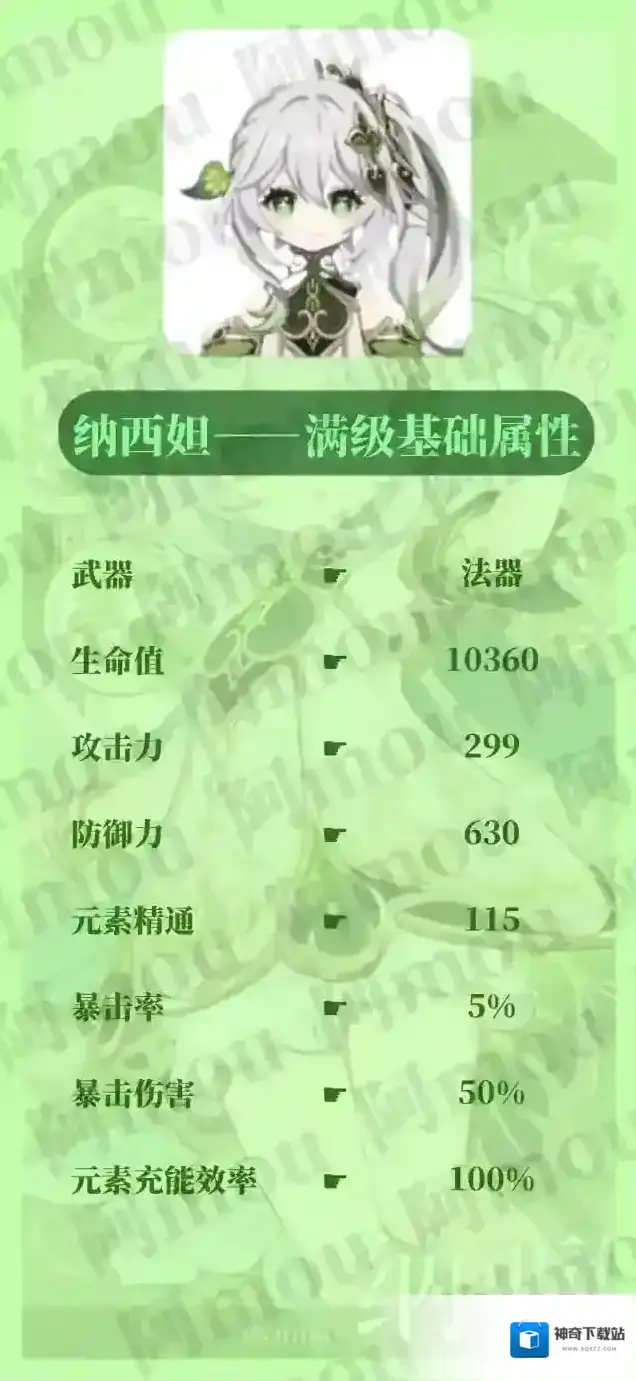 如图,草神和可莉,芭芭拉,砂糖这些角色类似属于法器角色。其他数值平平无奇,当然除了等级突破可以提升自身精通精通可是草神的主要加点需求,后面会细说~