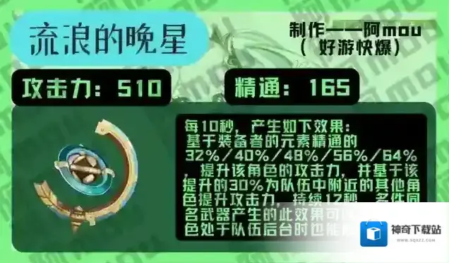 辅助向武器。精通副词条提供基础,虽然没千夜浮梦和祭礼残章那么多,但也不少。纳西妲带晚星可以通过被动–依靠提高自身精通提高自身攻击基础,还能以为(wèi)自身提供攻击基础折合30%收益于队伍中的其他角色。不过为队伍其他角色提供的不多,1000精通来算,精一晚星能为队友提供1000×32%×30%=96攻击力,精五则是96×2=192攻击力–相比其他角色提供的攻击力来说很少,但比没有强,起码让晚星不只是一个面板武器