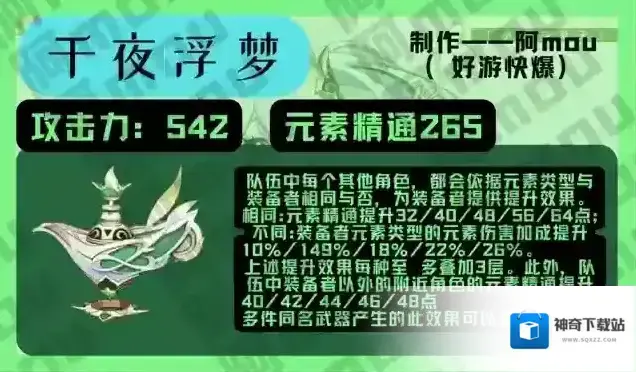 千夜浮梦是目前全法器里副词条提供精通最高的武器,使草神更容易毕业。重点是被动–有着类似四饰金随队伍情况而提供增幅效果的被动☛以同色角色数量为基础,提供自身精通;以异色角色数量为基础,提高自身元素伤害加成。第二层被动还可以为队内其他角色提供少量精通,增强自身还全队受益,妥妥的实用性意义上的专武