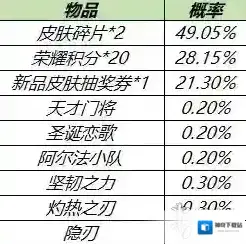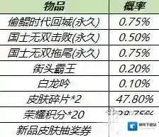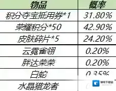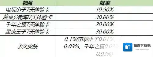 打开后必得皮肤碎片*2、铭文碎片*100和以下随机奖励之一:永久皮肤或皮肤体验卡(7日)1张(鲁班七号-电玩小子、诸葛亮-黄金分割率、李白-千年之狐、白起-星夜王子)