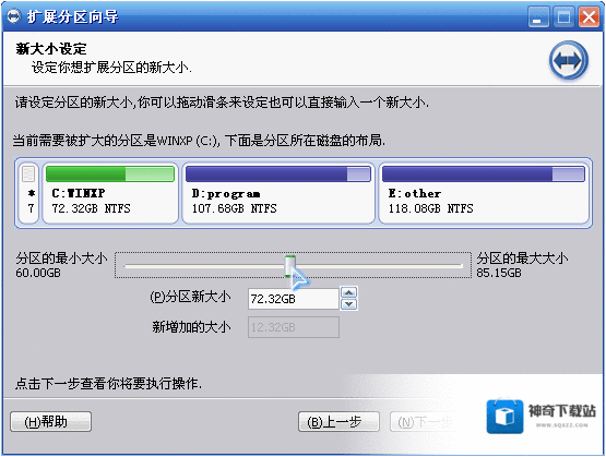 5、在点击上图4的“下一步”后,您将看下图5,在这里即可通过拖动滑块条来设置C盘的新大小。在将滑块条向右拖动的同时,您也将看到C盘的大小在增大,D盘大小在减少,如下图5所示: