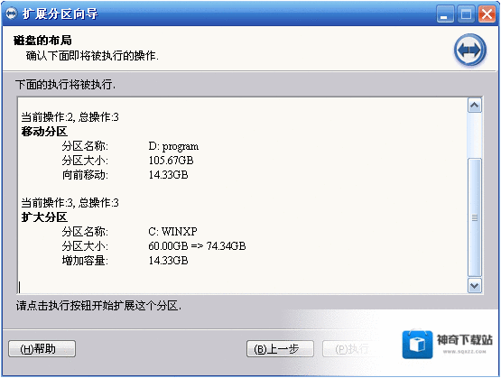 6、设定好C盘的新大小后,请点击上图5的“下一步”,进入确定执行页。在这个页面里程序将告诉您将执行什么操作。这里是将C盘从60GB扩大到74.34GB,如果您准备好了执行这个扩展操作,请点击“执行”按钮来开始执行。如下图6所示。