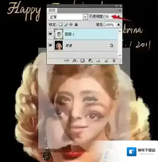4、选择图层一,把不透明度设置为50%,如下图所示:
