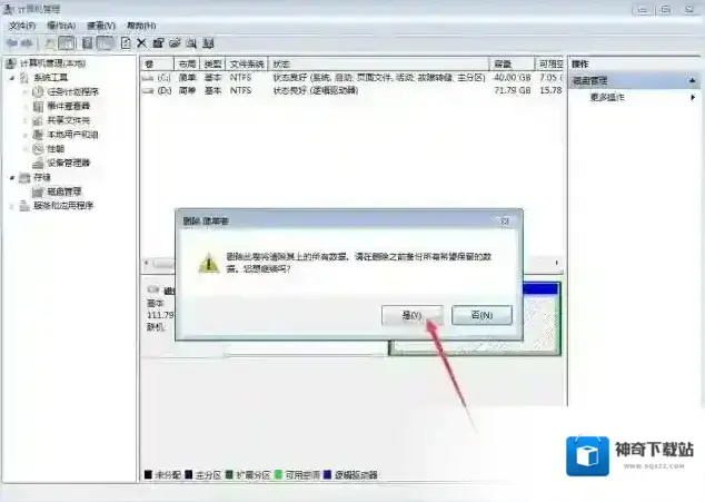 第四步、待相关的提示弹出后,按下“是”就可以了。另外,删除卷会删除其上的所有数据,因此最好提前进行备份。 上面就是如何删除win7分区硬盘的教学了,不知道大家学会了吗?