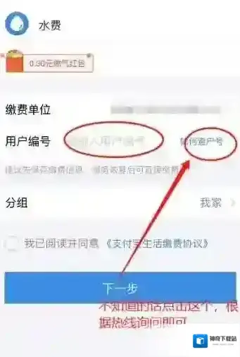 4、选择需要缴费的公司,并填写用户号,勾选协议,点击下一步;