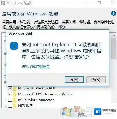 6、在 启用或关闭 windows 功能 界面,找到 internet explorer11 ,将前面的勾去掉,在弹出的提示框中点击 是 – 确定 将其卸载;