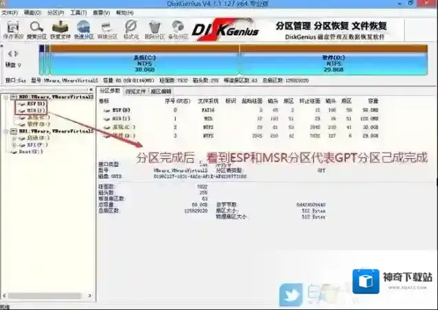 4、分区完成后,可以看到ESP和MSR分区已经完成,也就说明EFI系统引导分区已经建立完成,可以安装系统了;