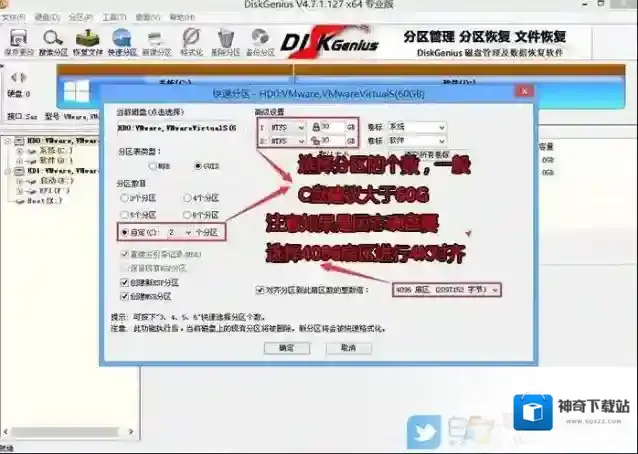 3、快速分区窗口中,选择GUID分区表类型,然后选择分区数目(大家可以根据实际情况看要划分多少个分区),勾选创建新ESP分区和创建MSR分区,然后就是磁盘空间大小的设置,推荐C盘大小大于60G比较好,最后如果是SSD固态硬盘的话,要选择4096扇区进行4K对齐;
