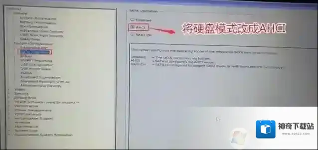 4、注意:切换到system configuration项,如果硬盘模式是raid,将sata operatior硬盘模式改为ahci模式,否则有些U盘进入PE后找不到硬盘,改了后选择退出并保存BIOS,如下图所示;