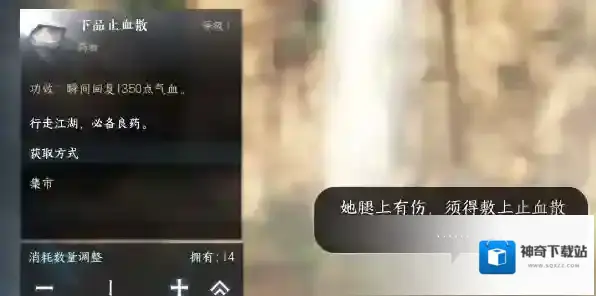 2、然后我们会在瀑布下面找到叶雪青,进行对话后,我们需要出示止血散;