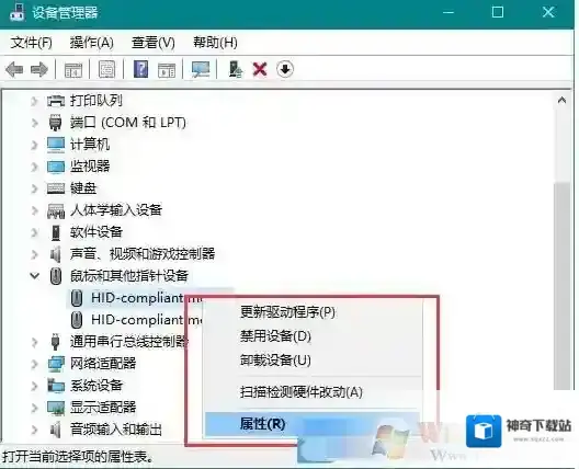 6、右键单击键盘下方的鼠标设备,在打开的菜单项中,选择属性;