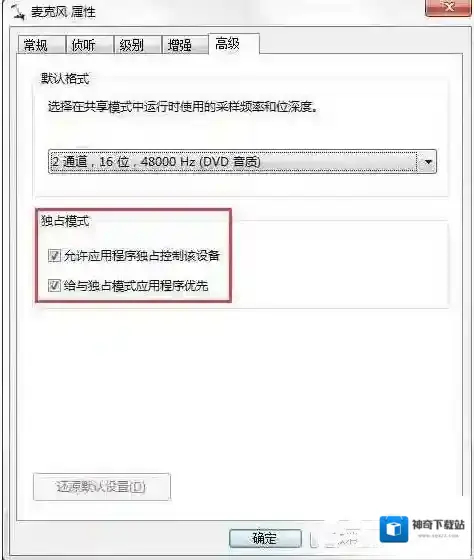 6、最后再在“高级”中,找到“独占模式”,在它下边有两个选项,全部打钩。分别是“允许应用程序独占控制该设备”“给与独占模式应用程序优先”。你还可以调下“默认格式”,如图所示: