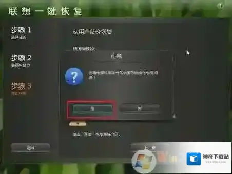 4、一键恢复会提示是否恢复,选择是,一键恢复就开始恢复了;