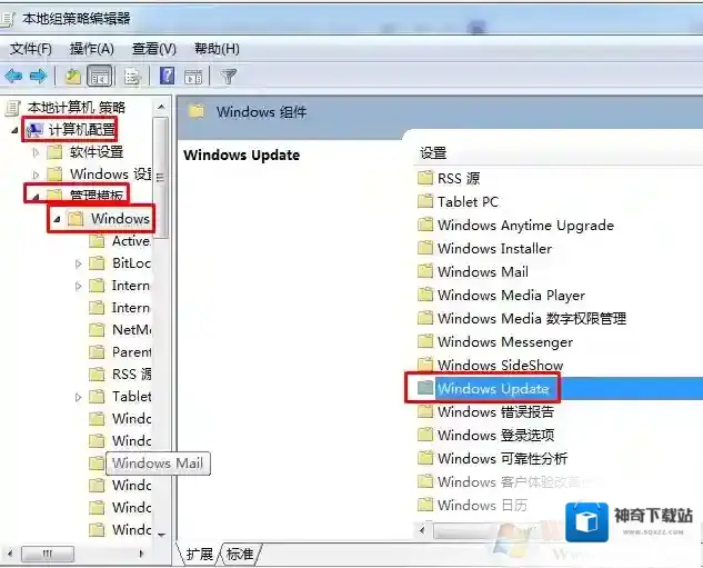7.依次点开左边栏,找到管理模板/Windows组件,找到Windows update,双击