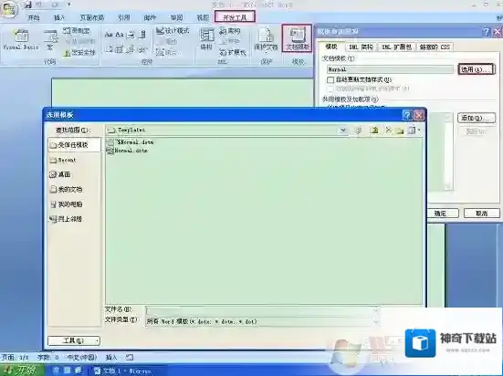 4、如果没有找到,那么就打开Word文档,点击Word文档上面的开发工具――文档模板,出现文档模板Normal,点击Normal后面的选用,就能看到原Normal.dot文件的保存处了。这时候如果文件夹里没有这个文件,我们从正常的电脑上拷贝一个 Normal.dot文件,存放到这个目录就可以了。这时候,Word打开出现“Microsoft office word 遇到问题需要关闭”的问题就完美解决了。