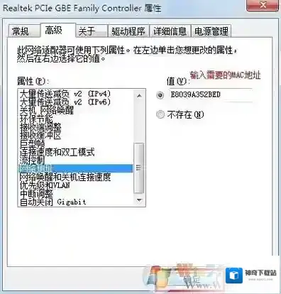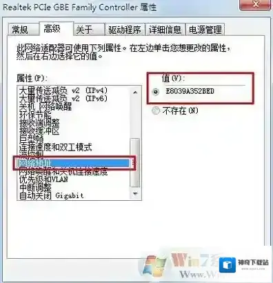 8、选择网络地址项,从右边的值框中输入新的mac地址。