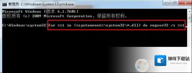 2、之后以管理员身份运行c:windowssystem32cmd.exe,输入for %%1 in (%systemroot%system32*.dll) do regsvr32 /s %%1回车即可