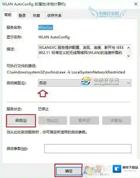 3、双击打开WLAN服务属性后,将启动类型改为“自动”,然后选择“启动”该服务,启动完成后,点击底部的“确定”保存即可,如图。